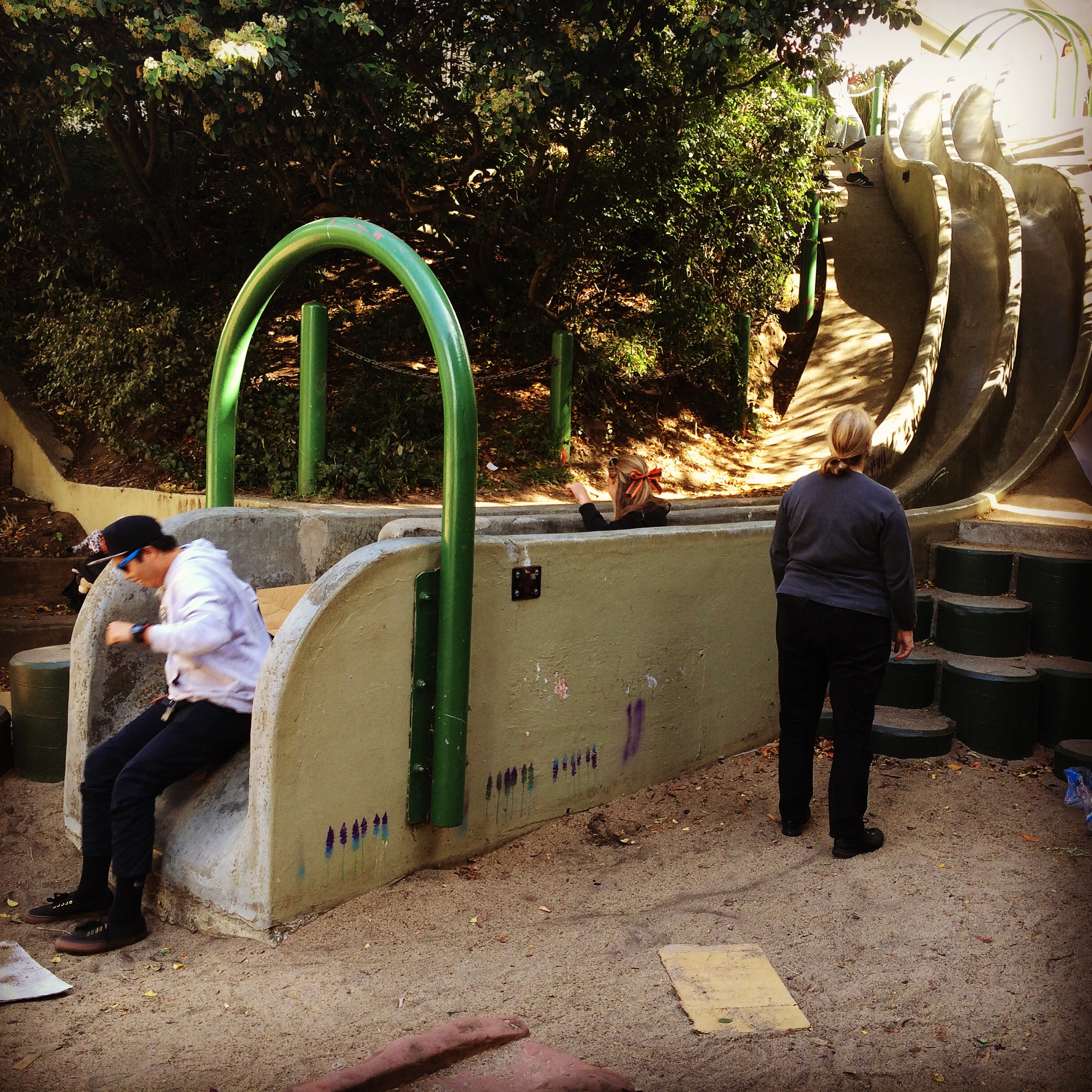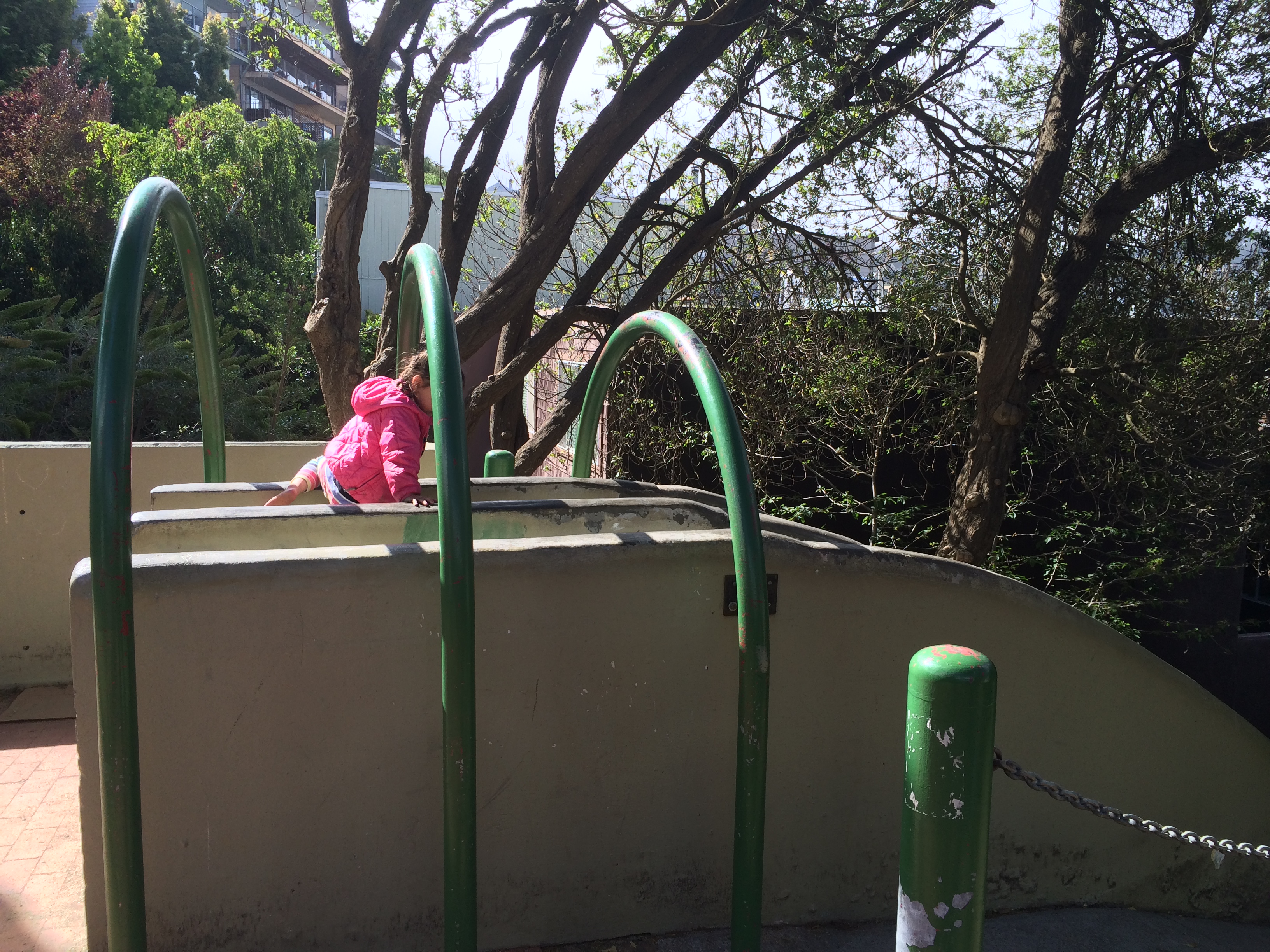 We headed towards the Castro area and parked our car in the area of Seward and Douglas. It was here we found a charming San Francisco neighborhood and an awesome homemade park boasting a large dual-cement slide for children. The Seward Mini Park was built in 1973 after a young girl proposed it as an alternative to development.