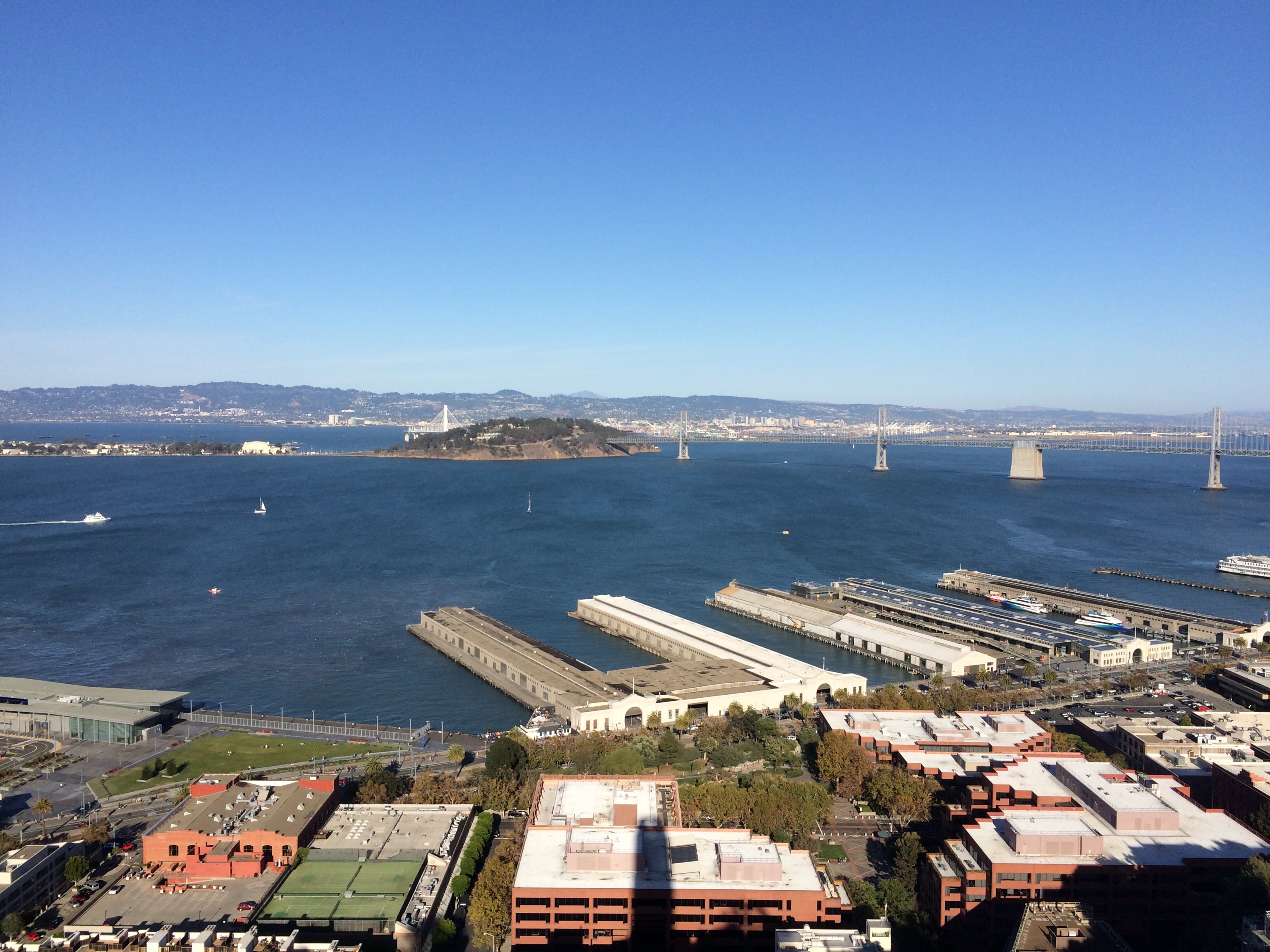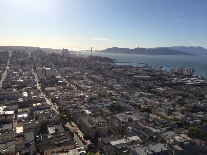 Once up at the top of the tower one fights one’s way through throngs of people taking selfies but the 360 degree view is totally worth it.  Views of Angel island, Alacatraz, Treasure island, the Bay and Golden Gate bridges, and the City itself are to behold.  When you are up in this tower it reminds you that San Francisco is truly the most glorious city in the United States.  (Sorry NY but SF is pretty darn awesome on a nice warm, clear day.)