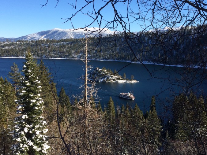 If you look closely you can see the tiny tea house built atop the island in Emerald Bay where the original owner would frequently visit many years ago.
