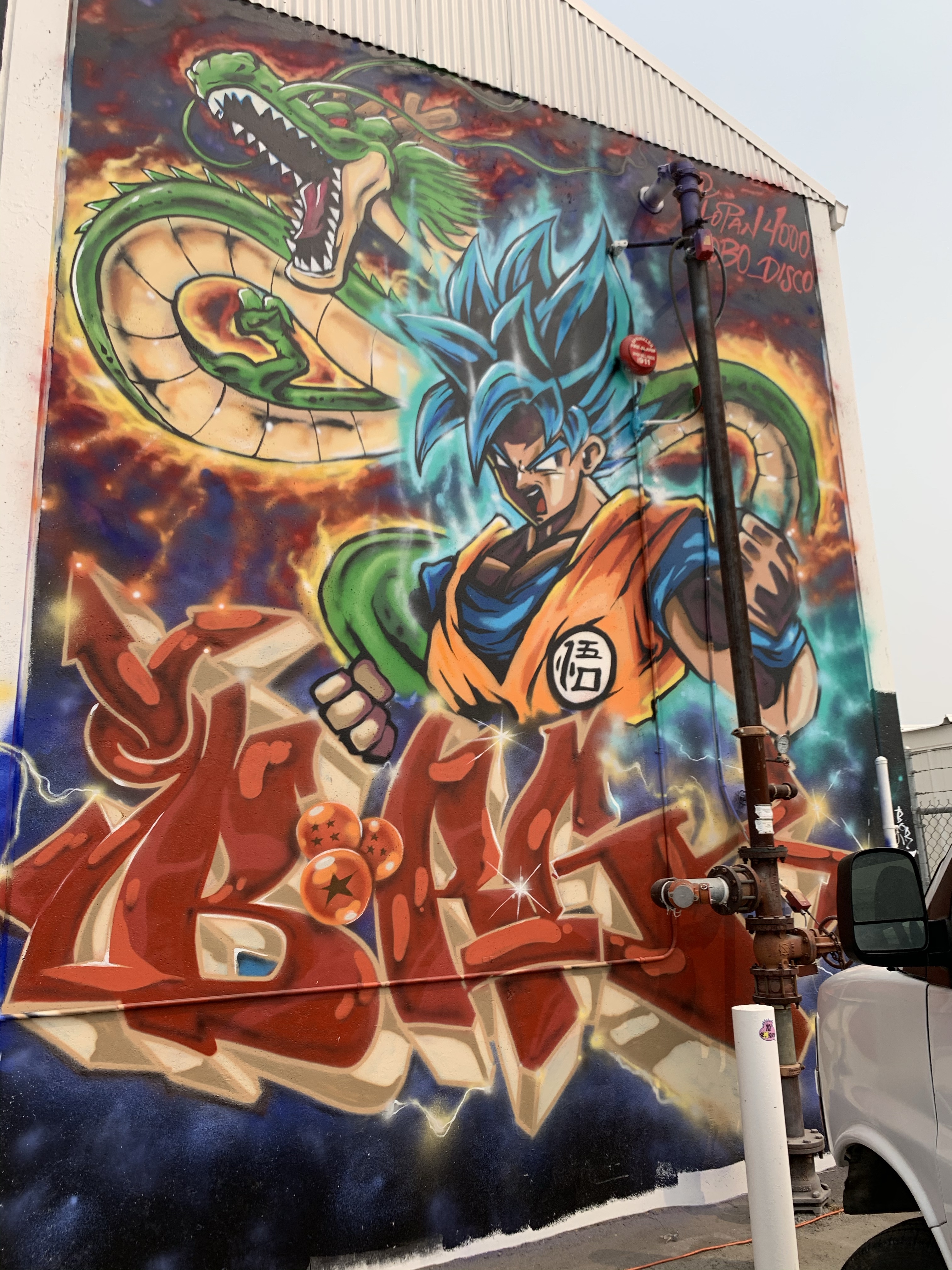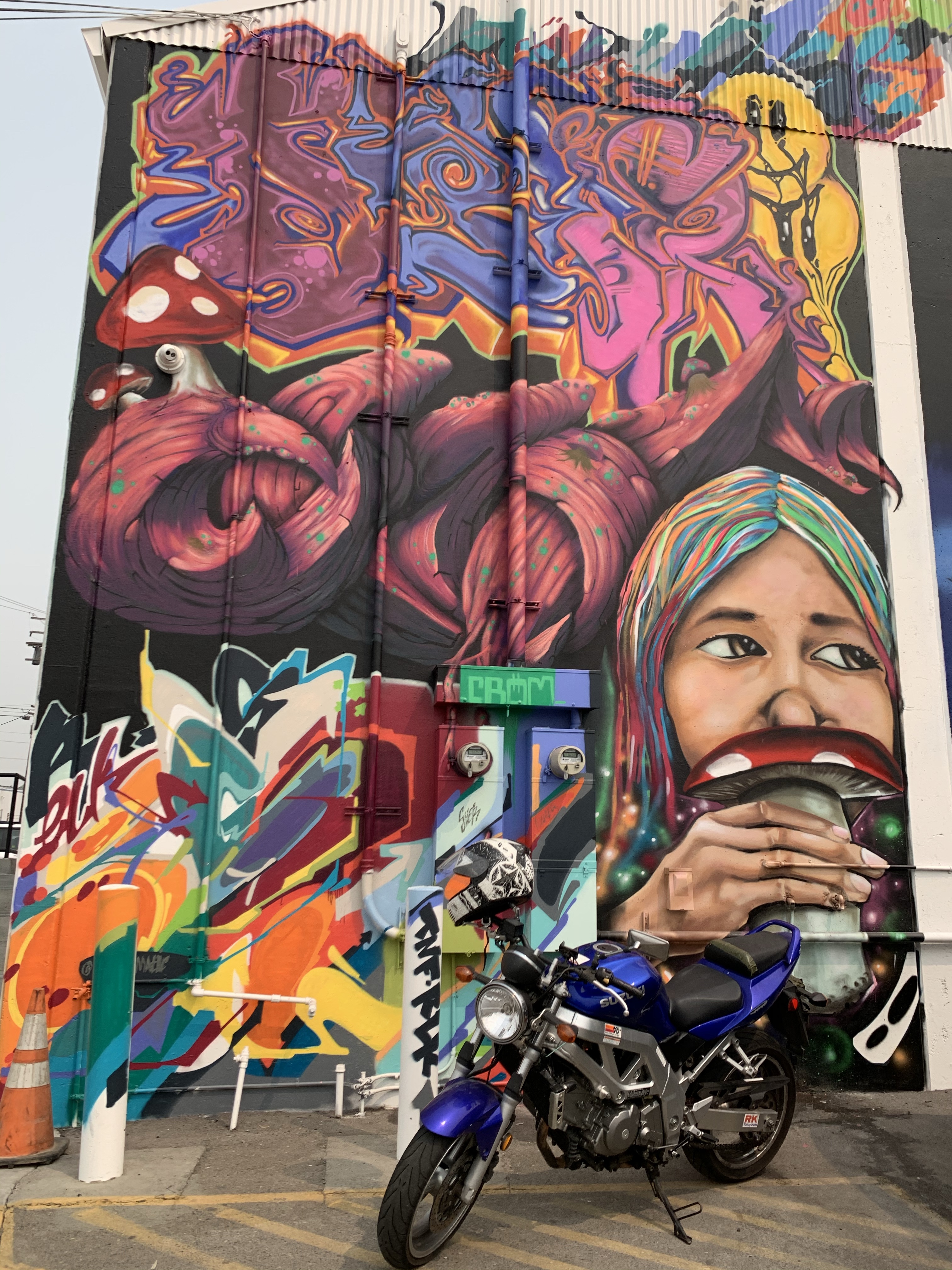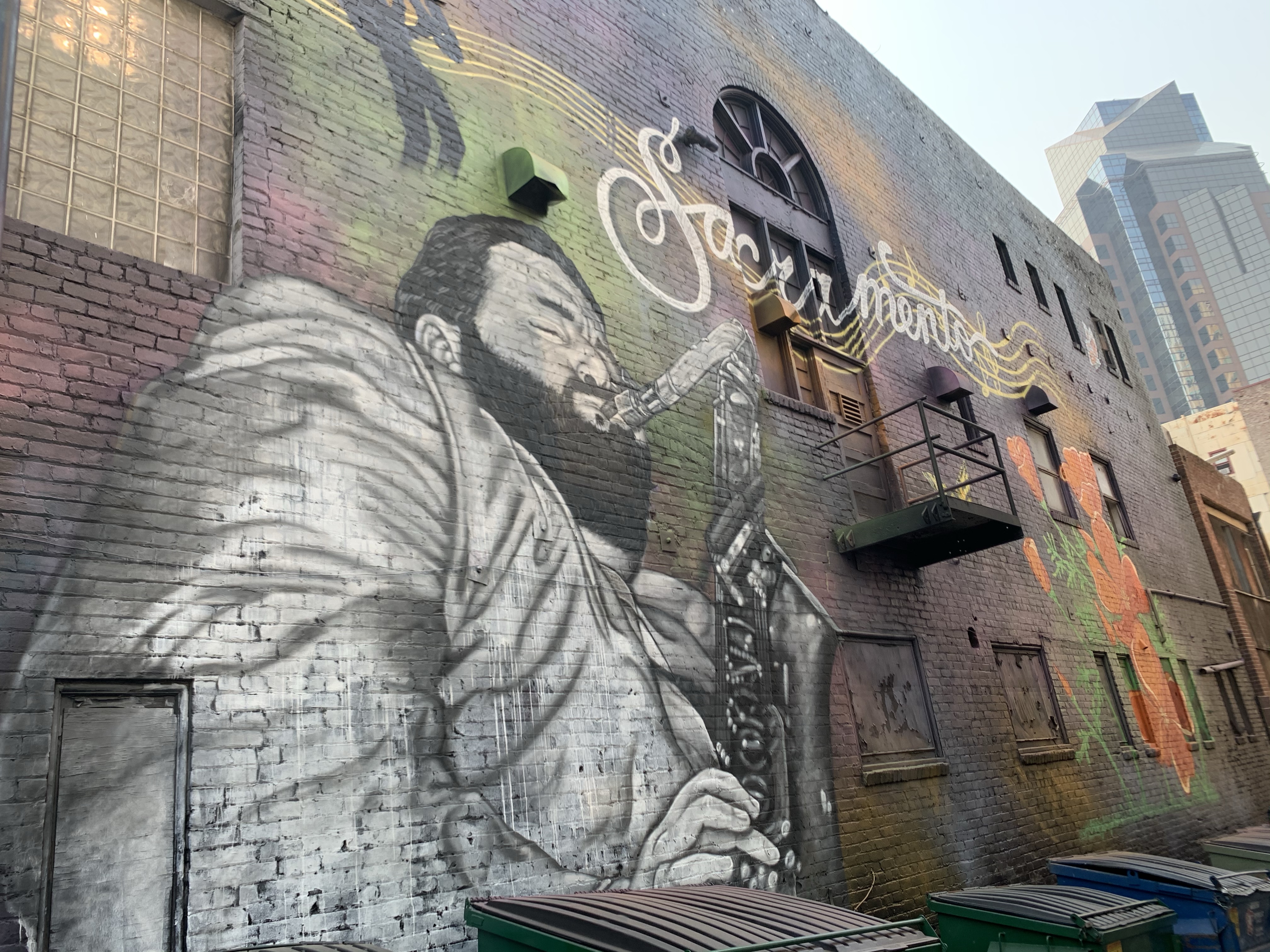 This mural is large and in charge. The alley may not smell good but the mural is impressive and commands the space. I saw a great photo of the actual saxophonist playing his instrument in front of the mural which is pretty awesome. And its interesting the artist chose to use red and orange poppies since the California Poppy is king in these parts. I can’t help but wonder just how much paint was used to paint this wall black before they even got started on the rest…