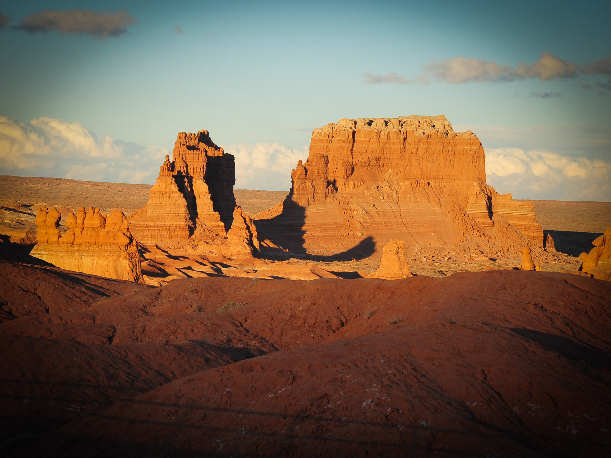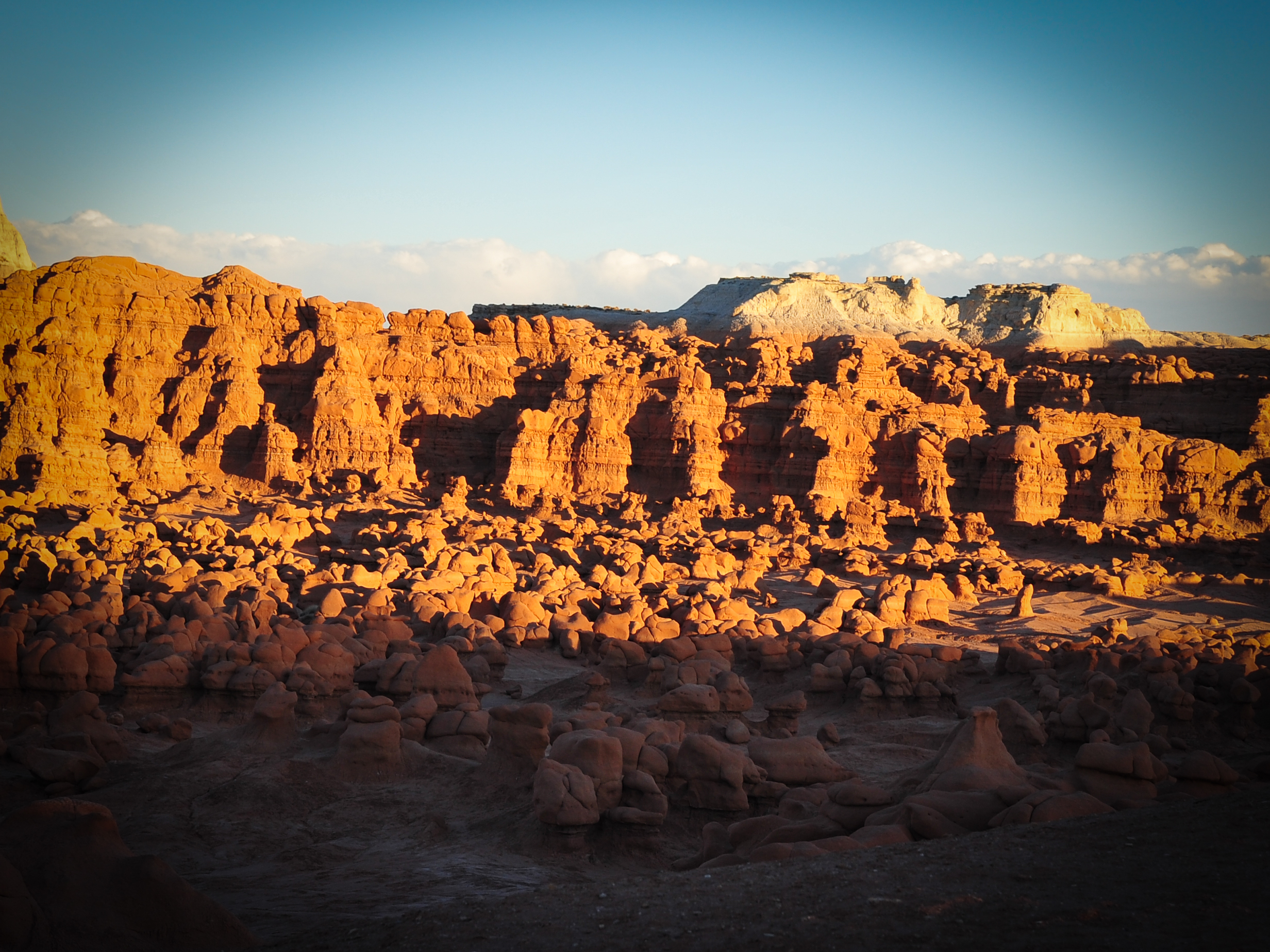 For us, the most interesting part of the park was the Hoodoo Goblins at sunset.  We took a walk through the Hoodoos enjoying their personality and mysticism. Mother Nature has created strange and interesting shapes here proving she has a sense of humor.  When the light is right one can understand why they call them Goblins!  The rock formations were created 170 million years ago and still stand proudly today.  Hundreds of these mushroom shaped formations stand each one with its own personality.  Some are fifteen feet tall some or are two feet tall.  Some are narrow some are plump.  Some are solid and some are precariously levitating.   The rock creatures are set in front of gorgeous Utah cliffs slowly eroding away creating an ever changing piece of natural art.